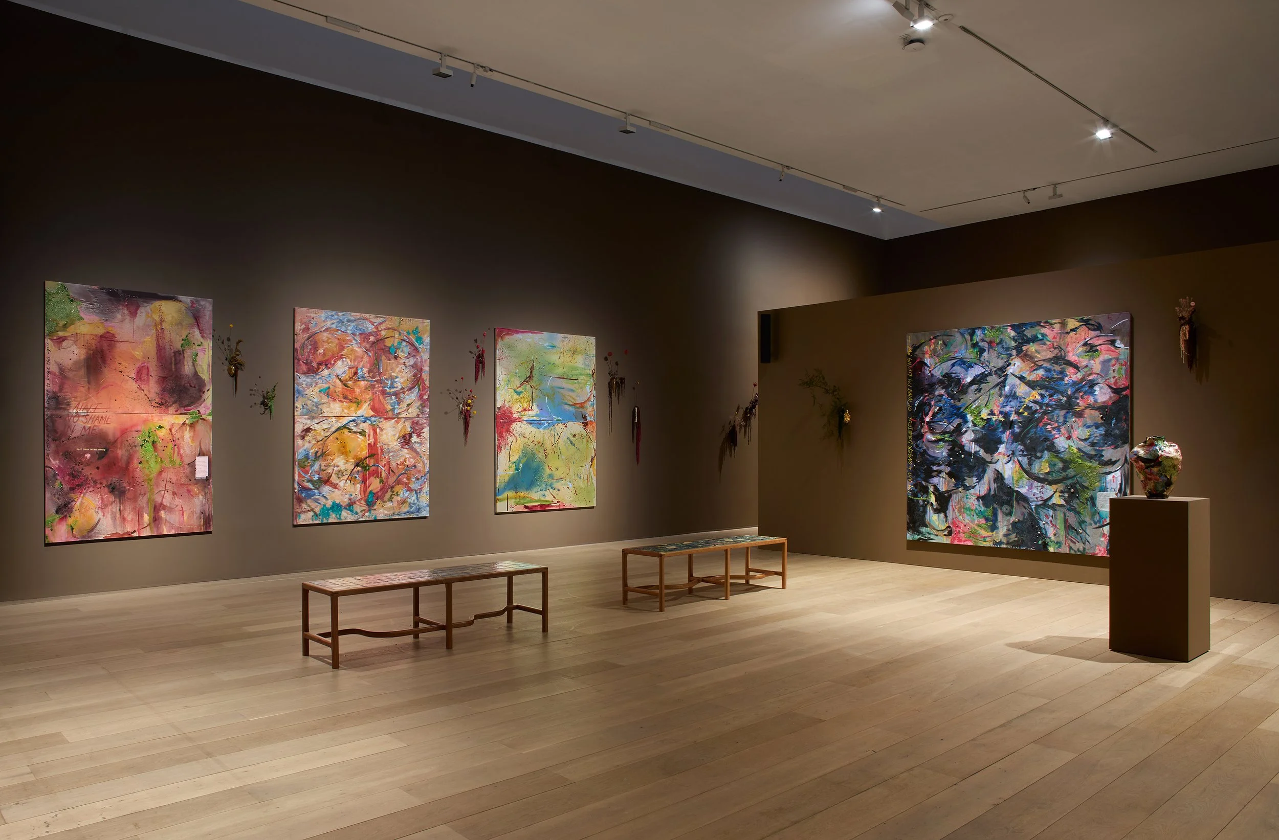 The exhibition, formed entirely of new work, centres on a series of 14 paintings and six ceramic vessels presented within a multidimensional installation designed by the artist and accompanied by a bespoke musical score by composer Alex Gruz.